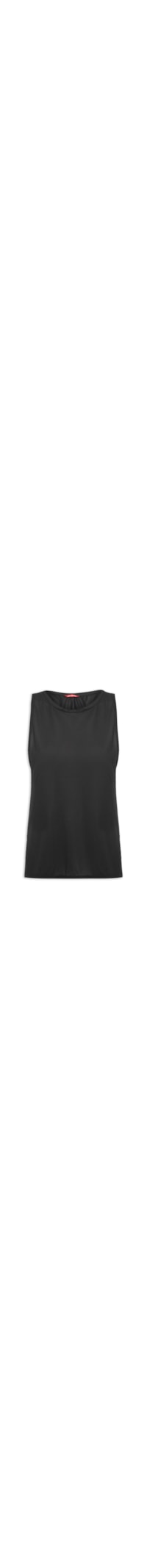 A regata preta é confeccionada em mesh. A peça possui decote redondo, cavas regulares, alças médias, shape solto, fendas nas laterais, caimento reto, tag da marca aplicada na parte posterior e acabamento pespontado.