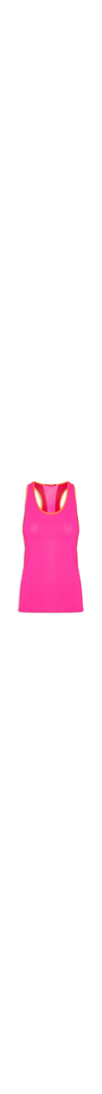 A regata rosa neon é confeccionada em malha de poliamida. A peça possui decote U, alças médias, cavas regulares, recortes laterais em cor contrastante, nome da marca em cor contrastante na parte posterior, shape solto, caimento reto e acabamento pespontado.