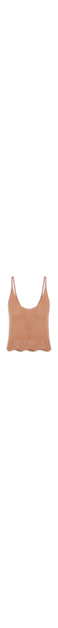 A regata marrom é confeccionada em tricot em diferentes pontos. A peça possui decote V, alças finas, cavas levemente estendidas, shape solto, caimento reto e acabamento canelado.