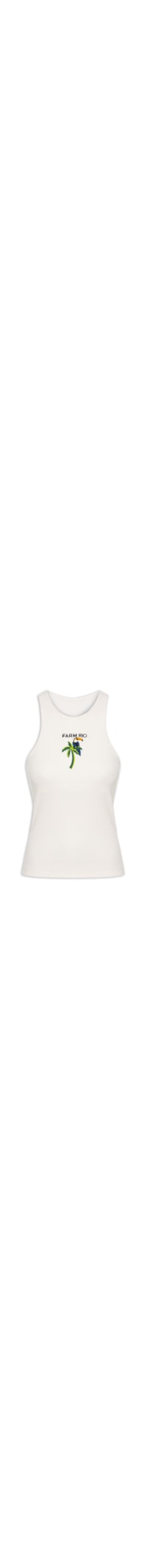 A regata branca é confeccionada em malha de algodão com alta elasticidade. A peça justa ao corpo possui decote frontal redondo e posterior trapézio, alças finas, cavas regulares e bordado figurativo de tucano com detalhe de escrita com nome da marca aplicados em cores contrastantes.