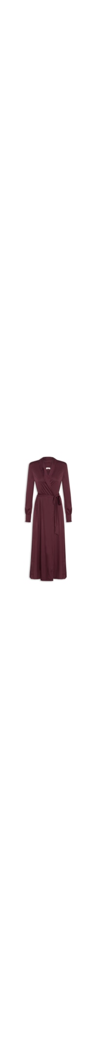 O robe vinho é confeccionado em tecido leve com média elasticidade. A peça solta ao corpo possui lapela xale, mangas longas com aplicação de lastex nos punhos, bolso frontal, passantes aplicados na cintura, comprimento midi e fechamento por amarração. Acompanha faixa de espessura média do mesmo tecido e cor para uso opcional.