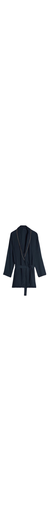 Roupão em modal com estampa de listras verticais em tons suaves. Possui costas em um tom contrastante e cintura com cinto para amarrar.