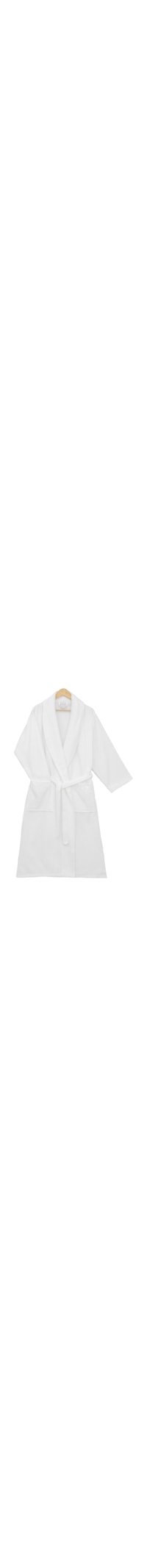 O roupão branco é confeccionado em tecido atoalhado. A peça possui lapela xale, mangas longas, passantes aplicados na altura da cintura, bolsos frontais, comprimento alongado e shape solto. Acompanha faixa na mesma cor e tecido para uso opcional.