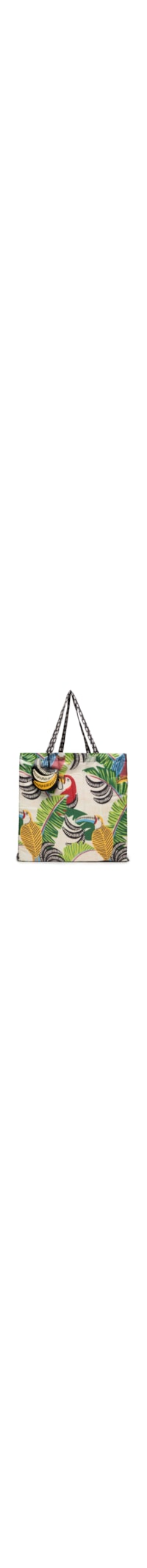 A sacolinha preta é produzida em material têxtil leve. A peça possui tamanho grande, formato retangular amplo, estampa tropical com ilustração de tucano e folhagens, padronagem lateral listrada em cores contrastantes, alças de ombro alongadas, compartimento interno espaçoso e acompanha pouch removível em formato de folha com fechamento por zíper e mosquetão para fixação.