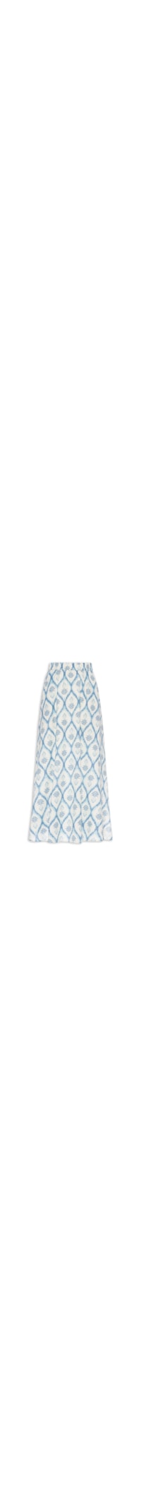 A saia azul é confeccionada em tecido leve sem elasticidade. A peça solta ao corpo possui cintura alta, cós com elástico embutido, bolsos frontais modelo faca, forro curto, fendas laterais, mix de estampas em cores contrastantes e comprimento midi.