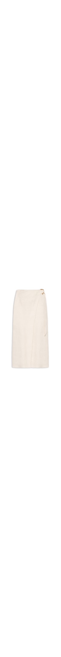 A saia bege é confeccionada em linho sem elasticidade. A peça solta ao corpo possui cintura alta, pences posteriores, tecido sobreposto na parte frontal, tira alongada lateral com passante metálico na cor dourada, fenda frontal, forro, comprimento midi e fechamento posterior por zíper invisível.