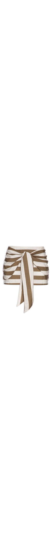 A saia marrom é confeccionada por tecido leve sem elasticidade. A peça solta ao corpo possui cintura média, padronagem listrada em cor contrastante, recorte frontal com amarração, fechamento por zíper e comprimento curto.