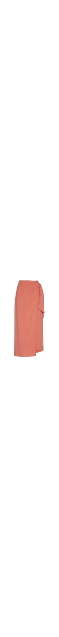 A saia vermelha é confeccionada em tecido leve sem elasticidade. A peça solta ao corpo possui cintura alta, sobreposição frontal com pregas, faixas alongadas na altura da cintura, barra assimétrica, comprimento midi e fechamento lateral por amarração.