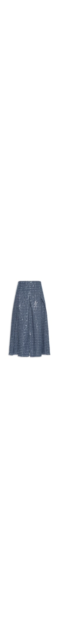 A saia azul é confeccionada em tecido encorpado com superfície em paetê sem elasticidade. A peça solta ao corpo possui cintura alta, cós amplo, bolsos frontais embutidos, pregas frontais e posteriores, forro, fenda frontal, padronagem mini destroyed* com detalhes em branco e comprimento midi.
