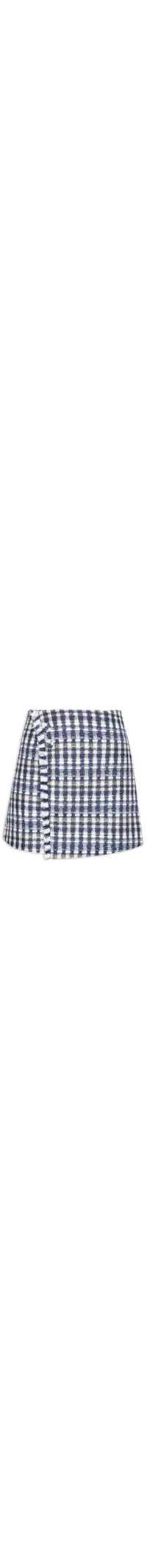 a saia Azul é Confeccionada Em lã Sem Elasticidade. A Peça Solta Ao Corpo Possui Cintura Alta, Recorte Frontal Com Detalhes Em Babados E Botão Aplicado, Forro, Fechamento Por Zíper Posterior E Comprimento Curto.