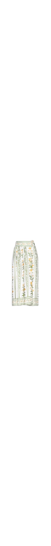 A saia verde é confeccionada em tecido leve sem elasticidade. A peça solta ao corpo possui cintura alta, cós com elástico embutido na parte posterior, recorte frontal sobreposto com fechamento por botões, fenda frontal, estampa floral em cores contrastantes e comprimento longo.