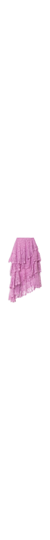 A saia lilás é confeccionada em renda sem elasticidade. A peça solta ao corpo possui cintura alta, babados em camadas sobrepostas, trama floral vazada, forro, barra assimétrica, comprimento midi e fechamento lateral em zíper invisível.