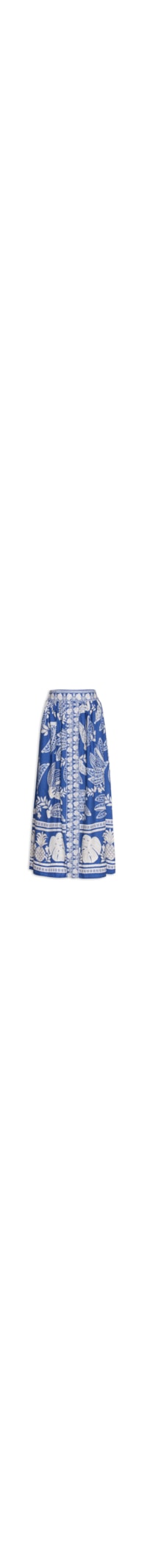 A saia azul é confeccionada em tecido leve sem elasticidade. A peça solta ao corpo, possui cintura alta, cós com elástico embutido na parte posterior, fenda frontal, mix de estampas em cor contrastante, comprimento midi e sem fechamento.