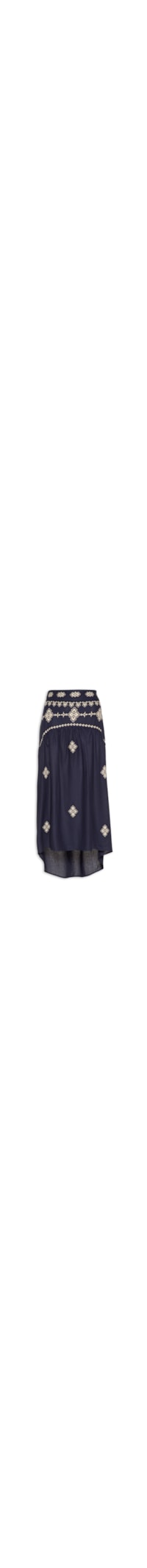 A saia azul marinho é confeccionada em tecido leve com toque de linho sem elasticidade. A peça solta ao corpo possui cintura alta, recorte na altura do quadril com detalhe de pregas, bordados de cor contrastante, barra mullet*, comprimento midi e fechamento posterior por zíper invisível.
