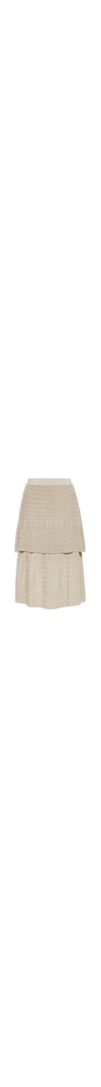 A saia bege é confeccionada em tricot canelado com superfície texturizada, fios de lurex e alta elasticidade. A peça solta ao corpo possui cintura alta, cós com elástico embutido, tag da marca aplicada em metal na parte posterior, sobreposição posterior e frontal, leve transparência e comprimento midi.