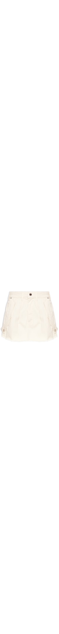 A saia bege é confeccionada em sarja sem elasticidade. A peça solta ao corpo possui cintura alta, cós com passantes, recorte posterior e frontal, bolsos posteriores, bolsos frontais modelo faca, abas sobrepostas na parte frontal com encaixe por botão de pressão, pregas frontais, barra desfiada, comprimento curto e fechamento frontal por botão de pressão e zíper.