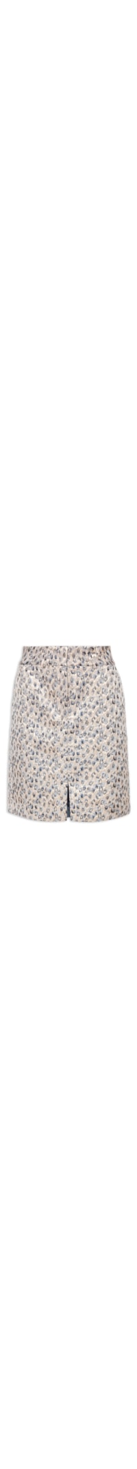 A saia bege é confeccionada em jacquard com fios de lurex e sem elasticidade. A peça justa ao corpo possui cintura alta, cós com passantes, bolsos frontais modelo faca, recorte frontal com fenda, comprimento cropped*, padronagem animal print e fechamento frontal por botão, colchetes e zíper.