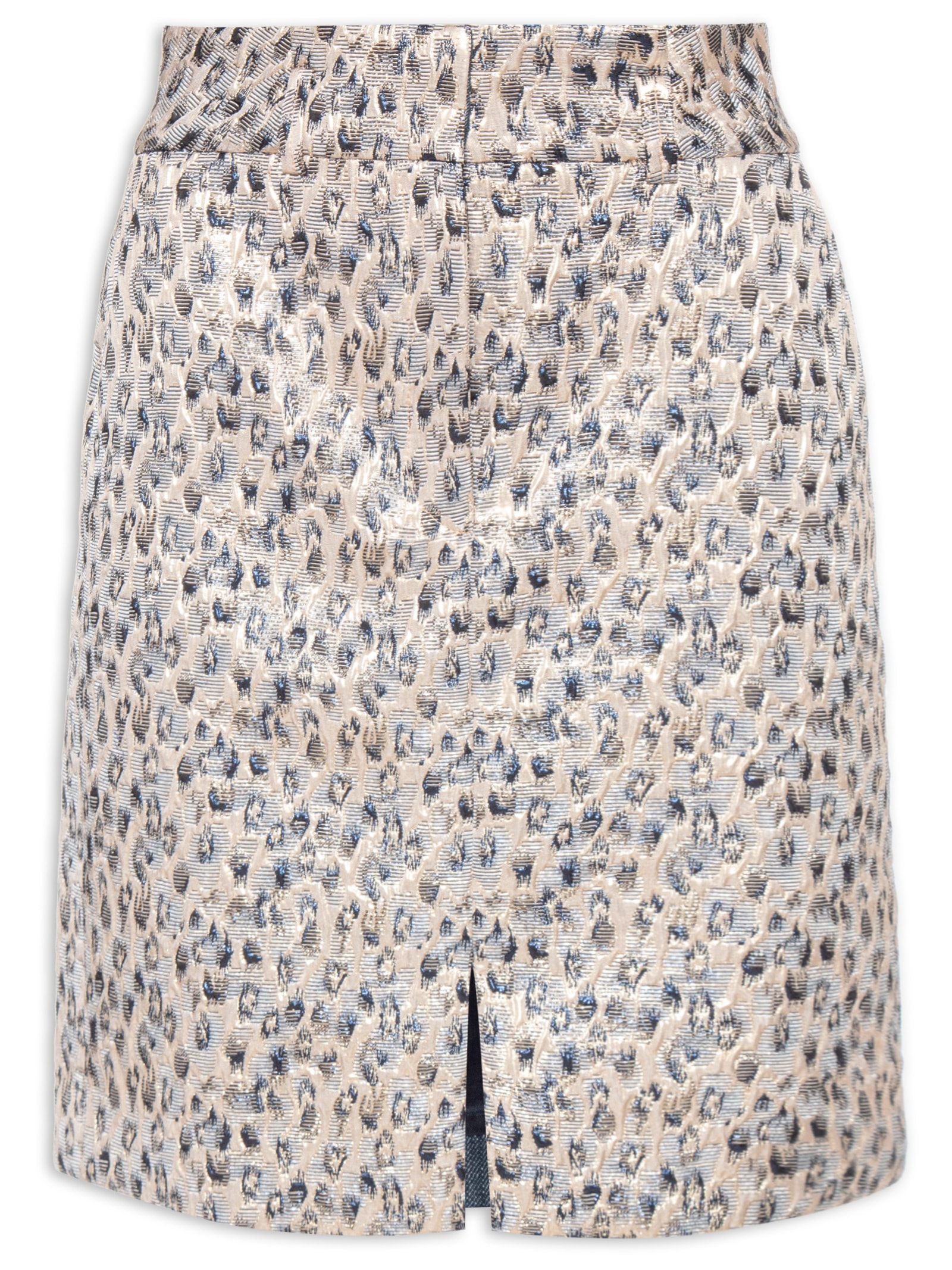 A saia bege é confeccionada em jacquard com fios de lurex e sem elasticidade. A peça justa ao corpo possui cintura alta, cós com passantes, bolsos frontais modelo faca, recorte frontal com fenda, comprimento cropped*, padronagem animal print e fechamento frontal por botão, colchetes e zíper.