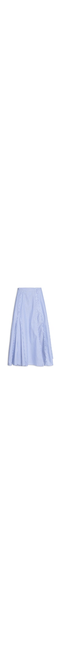 A saia azul é confeccionada por tecido leve sem elasticidade. A peça solta ao corpo possui cintura média, bolsos frontais no modelo faca, padronagem listrada em cor contrastante, recorte frontal sobreposto, fechamento frontal por botão e comprimento midi.
