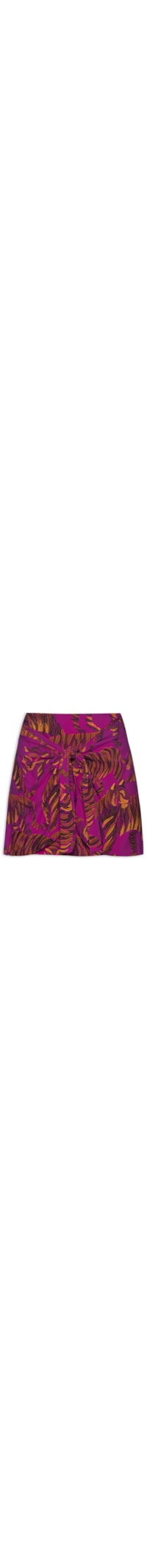 A saia rosa é confeccionada em tecido leve sem elasticidade. A peça solta ao corpo, possui cintura alta, detalhes frontais sobrepostos com amarração, estampa figurativa de tigres em cores contrastantes, comprimento curto e fechamento posterior por zíper invisível.