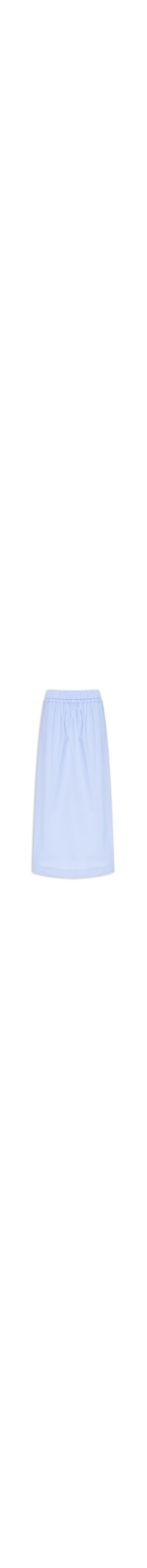 A saia azul é confeccionada em tecido leve sem elasticidade. A peça solta ao corpo possui cintura alta, cós com elástico embutido, bolsos frontais embutidos, meio forro, fendas laterais com acabamento arredondado e comprimento midi.