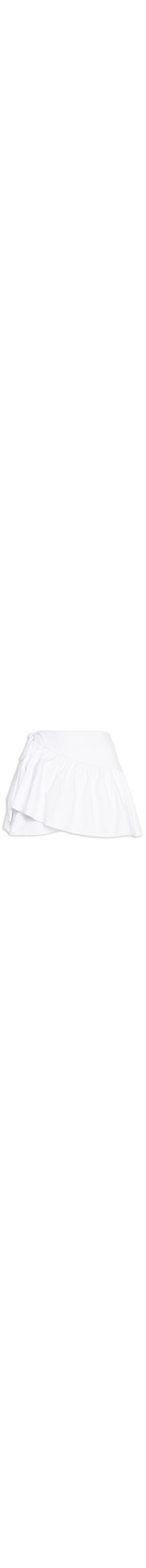 A saia branca é confeccionada em tecido leve sem elasticidade. A peça modelo pareô solta ao corpo possui cintura baixa, recorte frontal sobreposto, faixas laterais aplicadas para amarração, recortes frontais e posteriores com efeito de babados e comprimento curto.