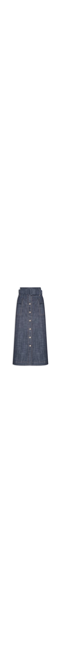 A saia azul é confeccionada em sarja com lavagem em jeans e baixa elasticidade. A peça solta ao corpo possui cintura alta, cós com passantes, pences posteriores, abas sobrepostas nas partes posterior e frontal, comprimento midi e fechamento frontal por botões. Acompanha cinto com espessura média para uso opcional.