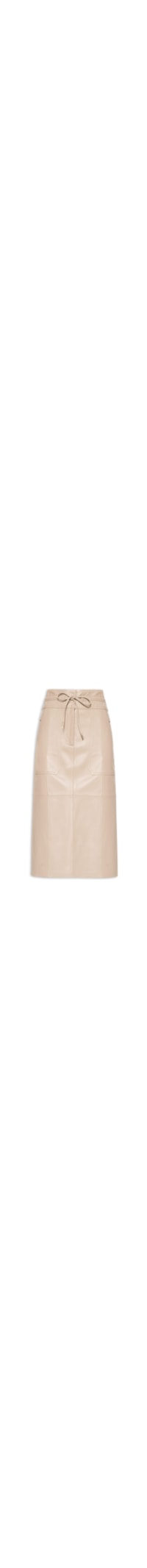 A saia bege é confeccionada em couro sem elasticidade. A peça solta ao corpo possui cintura alta, cós amplo com tira alongada embutida e elástico na parte posterior, bolsos frontais modelo faca, bolsos posteriores embutidos decorativos, recortes frontais e posteriores, fenda posterior, vista sobreposta nas laterais, comprimento midi e fechamento frontal por botões de pressão e zíper.