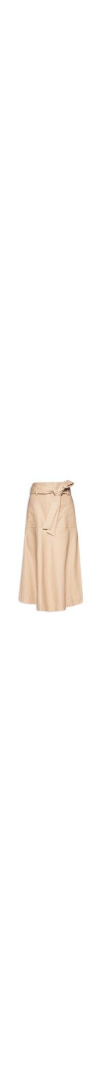 A saia bege é confeccionada em tecido leve sem elasticidade. A peça de modelo clochard* solta ao corpo possui cintura alta, cós com passantes, recortes posteriores e frontais, bolsos frontais embutidos, comprimento midi e fechamento frontal por colchete e zíper. Acompanha faixa no mesmo tecido e cor.