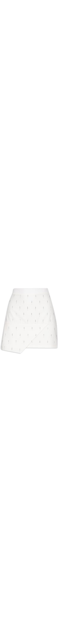 A saia off white é confeccionada em tecido leve sem elasticidade. A peça solta ao corpo possui cintura alta, recorte posterior, pences posteriores, recorte frontal com sobreposição com detalhe de assimetria, aplicações de strass, forro, comprimento curto e fechamento posterior por zíper.