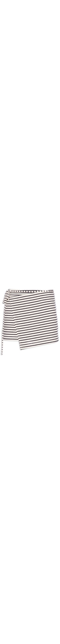 A saia preta é confeccionada em sarja sem elasticidade. A peça solta ao corpo possui cintura alta, modelo pareô, tiras alongas aplicadas nas laterais para amarração frontal, padronagem de listras na cor branca e comprimento curto.