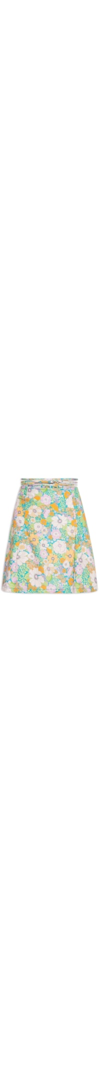 A saia verde é confeccionada em tecido leve. A peça possui cintura alta, cós com cordões aplicados na parte frontal para amarração, pregas posteriores e frontais, estampa floral em cores contrastantes, shape solto, caimento reto, comprimento curto, acabamento pespontado e fechamento posterior por zíper.