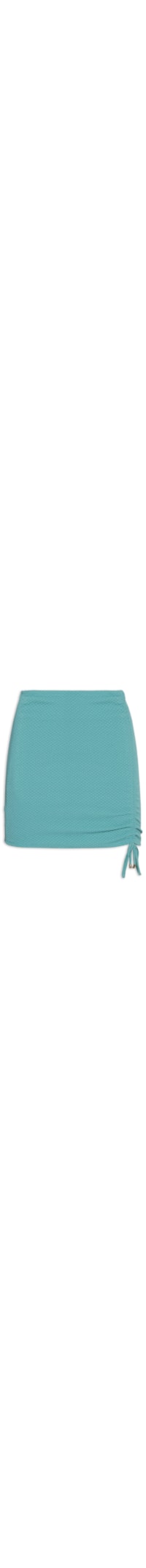 A saia verde é confeccionado em malha de poliamida com superfície texturizada e média elasticidade. A peça justa ao corpo possui detalhe frontal de franzido com cordão para regulagem com aviamentos metálicos em formato cilíndrico na ponta e comprimento curto.