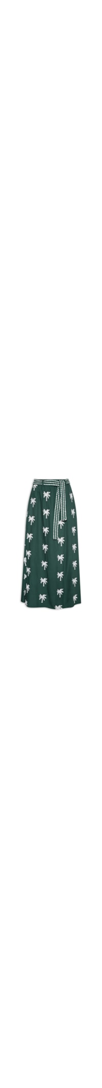 A saia verde é confeccionada em tecido leve com toque de linho. A peça solta ao corpo possui cintura alta, cós com passantes para cinto e lastex aplicado na parte posterior, dois bolsos laterais, mix de bordados de palmeiras em cor contrastante, tag da marca aplicada na parte posterior em metal, comprimento midi. Acompanha cinto em mesmo tecido com detalhes em cor contrastante para uso opcional.