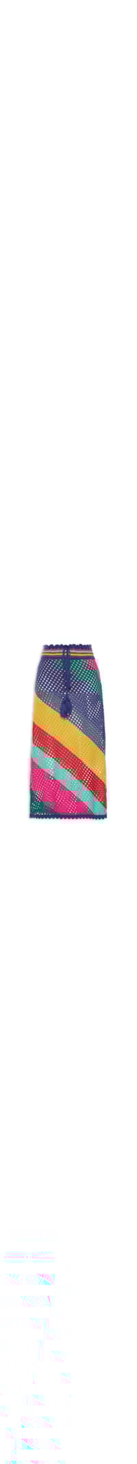 A saia azul é confeccionada em crochê. A peça possui cintura alta, cós com cordão embutido para ajuste, padronagem de listras em cores contrastantes, shape solto, caimento reto, comprimento midi e acabamento canelado. Acompanha hot pants na cor bege para uso opcional.