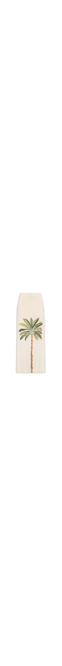 A saia bege é confeccionada em tecido leve com toque de linho e sem elasticidade. A peça justa ao corpo possui estampa figurativa de coqueiro em cores contrastantes, fendas laterais e comprimento longo.