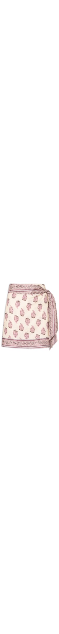 A saia bege é confeccionada em tecido leve com toque de linho e sem elasticidade. A peça solta ao corpo possui cintura alta, recorte frontal sobreposto com tiras alongadas aplicadas nas laterais para amarração, estampa em cores contrastantes, comprimento curto e fechamento lateral por zíper invisível.