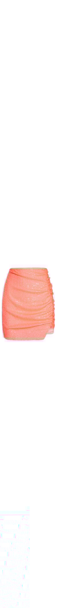 A saia laranja é confeccionada em tule com superfície em paetês. A peça possui cintura alta, recorte frontal com detalhe de franzido, pences posteriores, barra com recortes assimétricos na parte frontal, forro, comprimento curto, shape justo, caimento reto, acabamento pespontado e fechamento posterior por zíper metalizado com puxador.