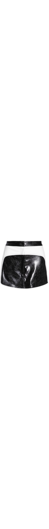 A saia preta é confeccionada em material sintético sem elasticidade. A peça solta ao corpo, possui cintura alta, recortes na parte superior e lateral na cor branca, recortes posteriores, comprimento curto e fechamento frontal por zíper e botão de pressão.