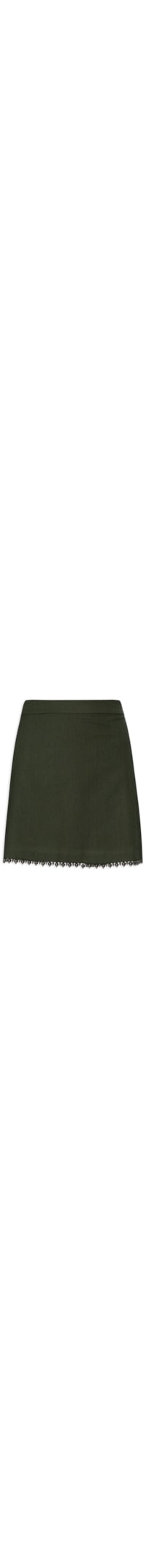 A saia verde é confeccionada em linho misto sem elasticidade. A peça solta ao corpo possui cintura alta, pences posteriores, barra com aplicação de aviamentos esféricos metalizados, forro, comprimento curto e fechamento posterior em zíper invisível.