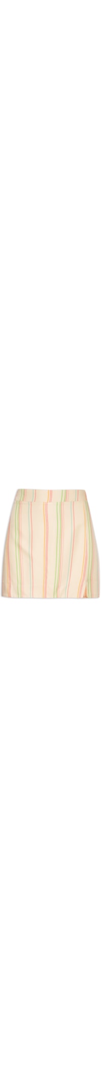 A saia bege é confeccionda em tecido leve sem eleasticidade. A peça justa ao corpo possui cintura alta, fenda frontal, pences posteriores, estampas listradas, fechamento em zíper e comprimento curto.
