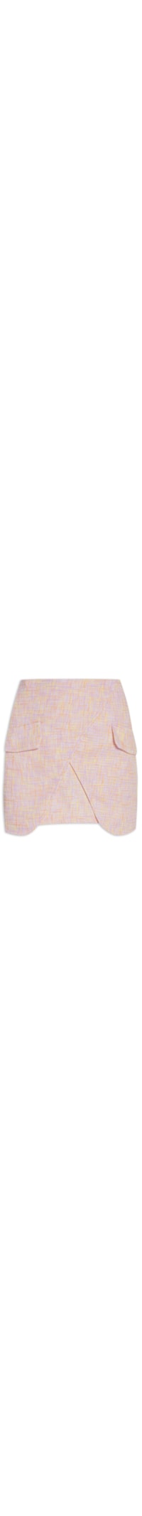 A saia rosa é confeccionada em tweed sem elasticidade. A peça justa no corpo possui cintura alta, recortes frontais sobrepostos com bolsos decorativos, tramados de cores contrastantes com fios de lurex, comprimento curto e fechamento posterior por zíper.