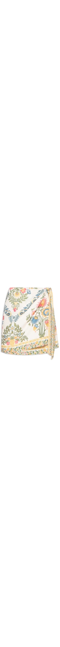 A saia bege é confeccionada em tecido leve sem elasticidade. A peça solta ao corpo possui cintura alta, recorte frontal sobreposto, faixas laterais aplicadas para amarração, mix de estampa em cores contrastantes e comprimento curto.