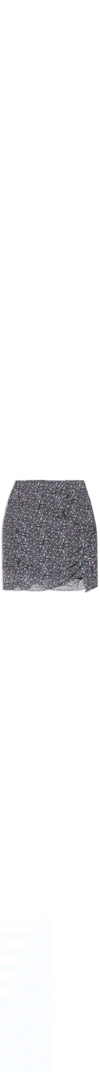 A saia preta é confeccionada em tecido leve. A peça possui cintura alta, recortes sobrepostos na parte frontal, detalhe de franzidos laterais, estampa floral em cores contrastantes, barra arredondada, forro, comprimento curto, shape solto e fechamento posterior por zíper invisível.