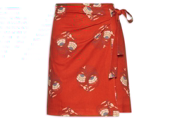 A saia vermelha é confeccionada em tecido leve com toque de linho sem elasticidade. A peça solta ao corpo possui cintura alta, tecido sobreposto com aplicações metálicas e fechamento frontal por amarração, mix de estampa em cores contrastantes, comprimento curto e fechamento lateral por zíper invisível.