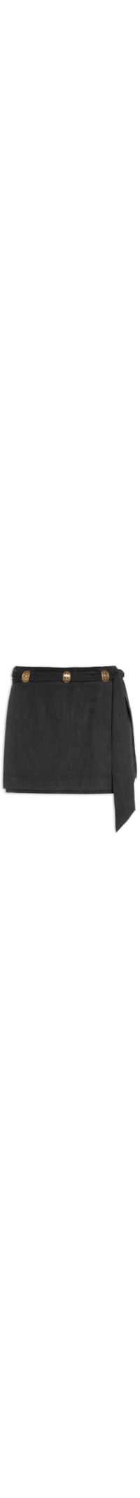 A saia preta é confeccionada em tecido leve sem elasticidade. A peça solta ao corpo possui cintura alta, pala sobreposta nas partes frontal e posterior com tiras alongadas para amarração frontal, aplicação de aviamentos metalizados na parte frontal, tecido sobreposto frontal e posterior, recortes laterais, comprimento curto e fechamento por amarração.