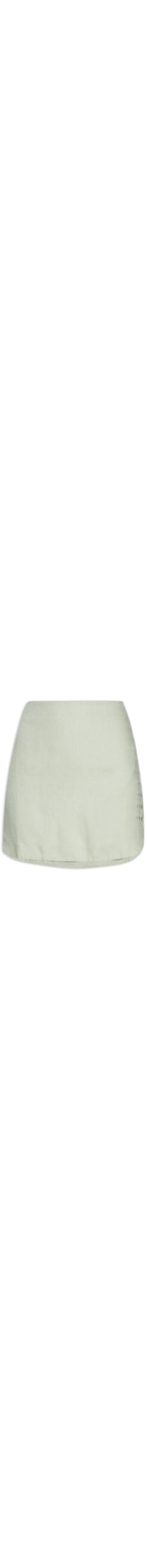 A saia verde é confeccionada em linho sem elasticidade. A peça solta ao corpo possui cintura alta, pences posteriores, aplicação lateral de bordados com detalhe de paetê metalizado embutido, barra arredondada, forro, comprimento curto e fechamento posterior por zíper invisível.