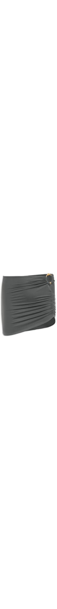 A saia cinza é confeccionada em malha de poliamida com alta elasticidade. A peça solta ao corpo possui cintura alta, cós assimétrico, argola circular metalizada aplicada no cós, efeito franzido lateral, caimento drapeado, barra assimétrica e comprimento curto.