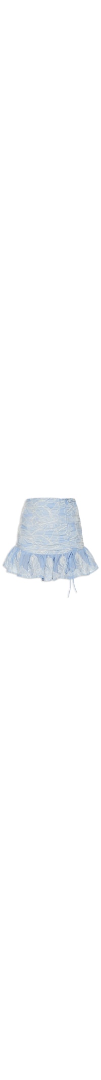 A saia azul é confeccionada em tecido leve. A peça possui cintura alta, aplicações de bordados de folhagens em cor contrastante, recorte na altura da barra com detalhe de pregas e babado e cordão embutido para ajuste com detalhe de franzido, comprimento curto, shape justo e fechamento lateral por zíper invisível.