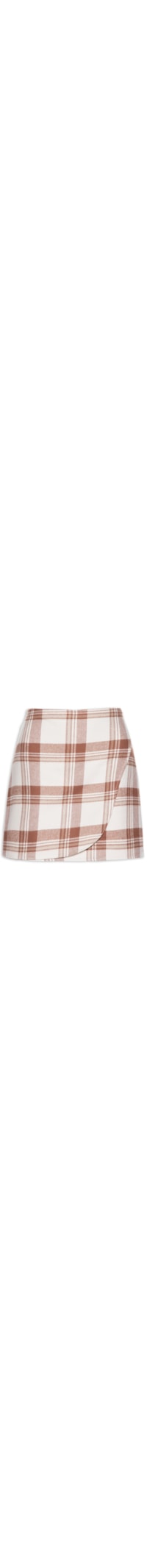 A saia off white é confeccionada em sarja com superfície texturizada sem elasticidade. A peça solta ao corpo possui cintura alta, pences posteriores, estampa xadrez na cor marrom, sobreposição frontal, comprimento curto e fechamento posterior por zíper invisível.